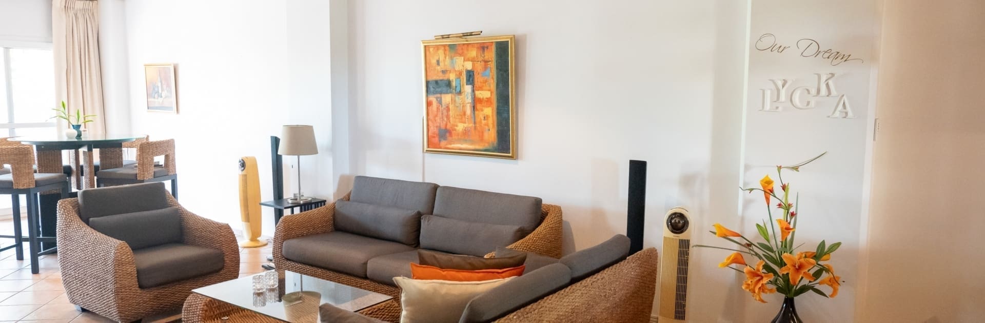 Værelse: To soveværelser, to badeværelser, åben plan stue og køkken, terrasse.